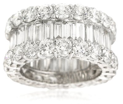 This is a handcrafted lady's, diamond & 18k white gold eternity wedding band! This beautiful ring features 35 baguette and 42 round brilliant cut white diamonds, prong set of F color, VS2 clarity and excellent cut and brilliance, weighing 8.90 carats total.This ring is size 6.5 and is approximately 11mm at the widest point. The thickness is 3.5mm.The ring can also be ordered to size and will take approximately 4-6 weeks to deliver. There may be an additional cost for larger sizes.